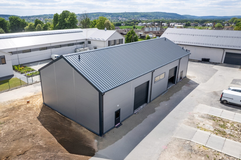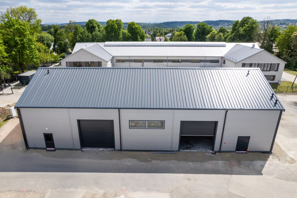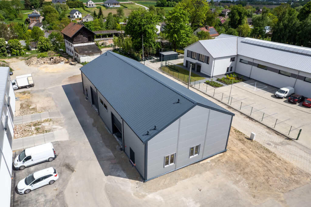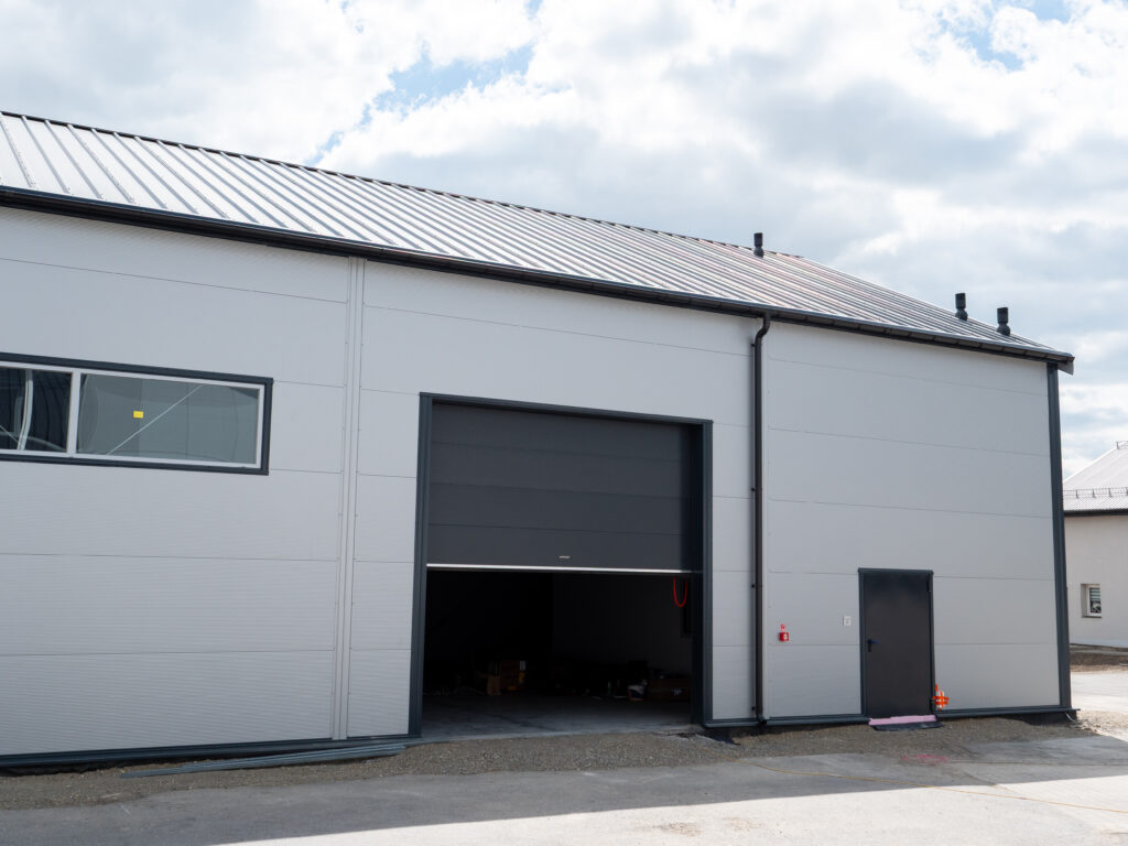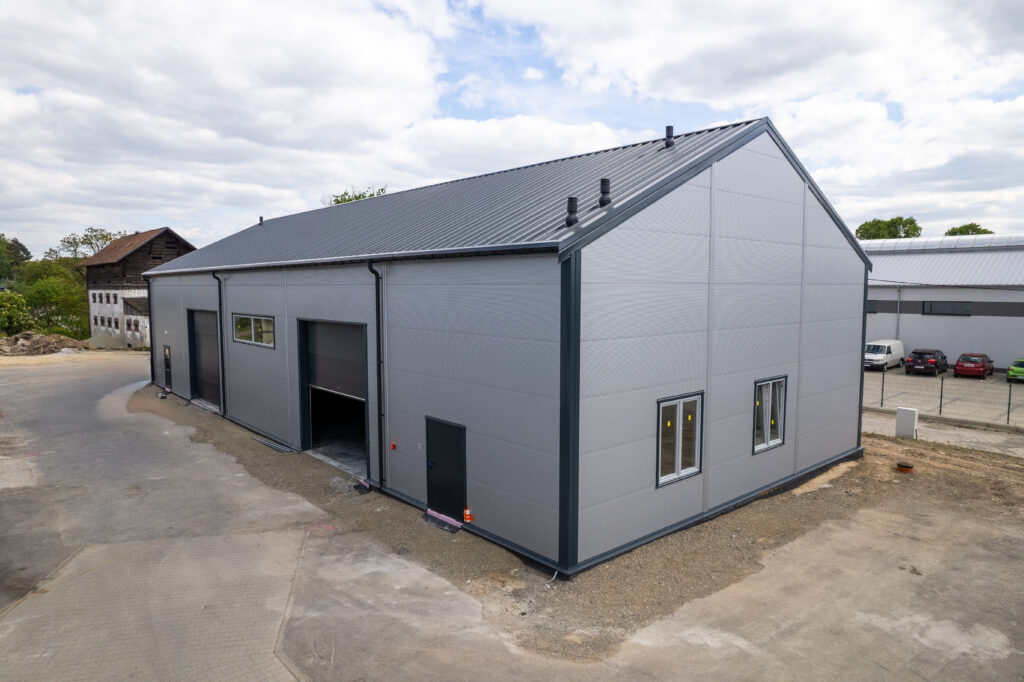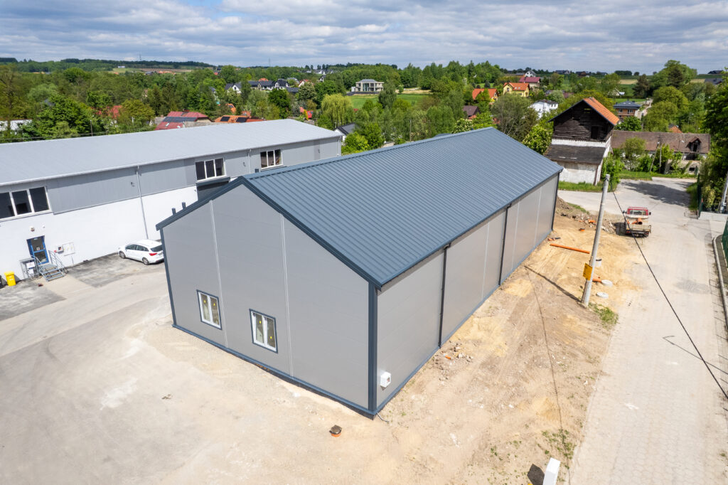 Isolierte Halle 14×30×5,5 m mit einer Fläche von 420 m², mit einem 25° geneigten Dach. Feuerverzinkte Stahlkonstruktion, Wände aus 120 mm PIR-Platten, Dach aus 160 mm PIR-Platten. Ausgestattet mit 2 4×4 m großen Toren, technischen Türen und PVC-Fenstern.
