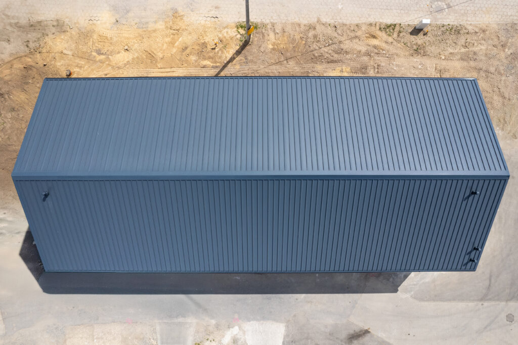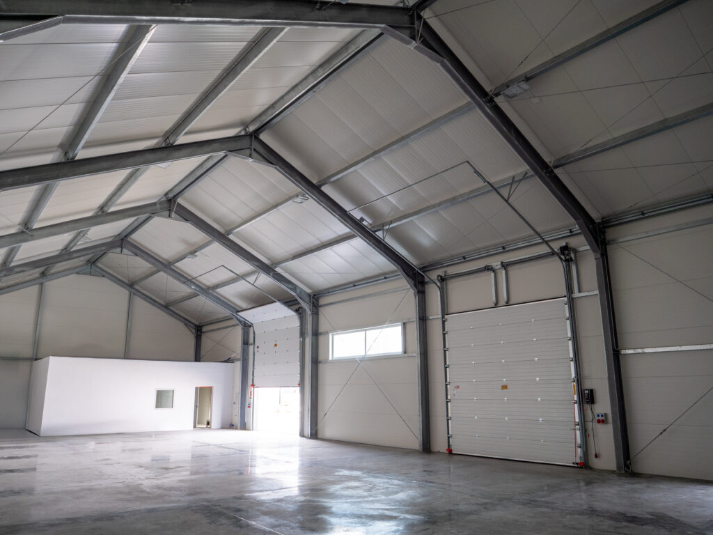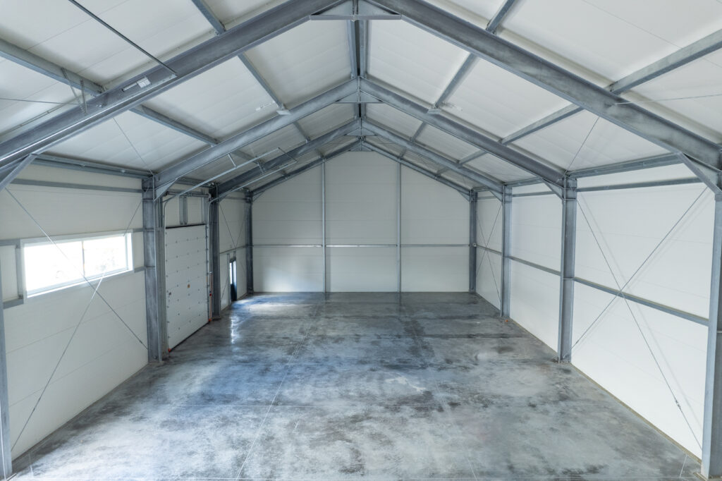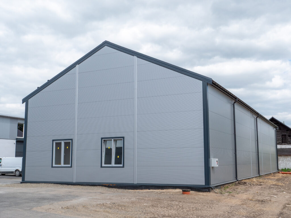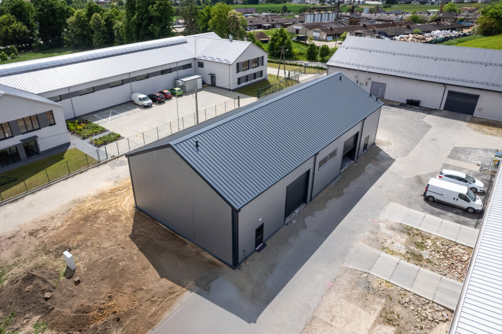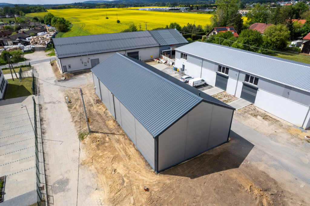 Isolierte Halle 14×30×5,5 m mit einer Fläche von 420 m², mit einem 25° geneigten Dach. Feuerverzinkte Stahlkonstruktion, Wände aus 120 mm PIR-Platten, Dach aus 160 mm PIR-Platten. Ausgestattet mit 2 4×4 m großen Toren, technischen Türen und PVC-Fenstern.