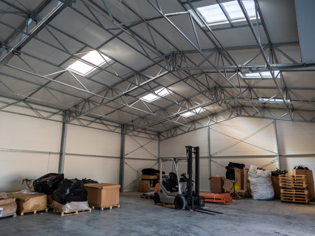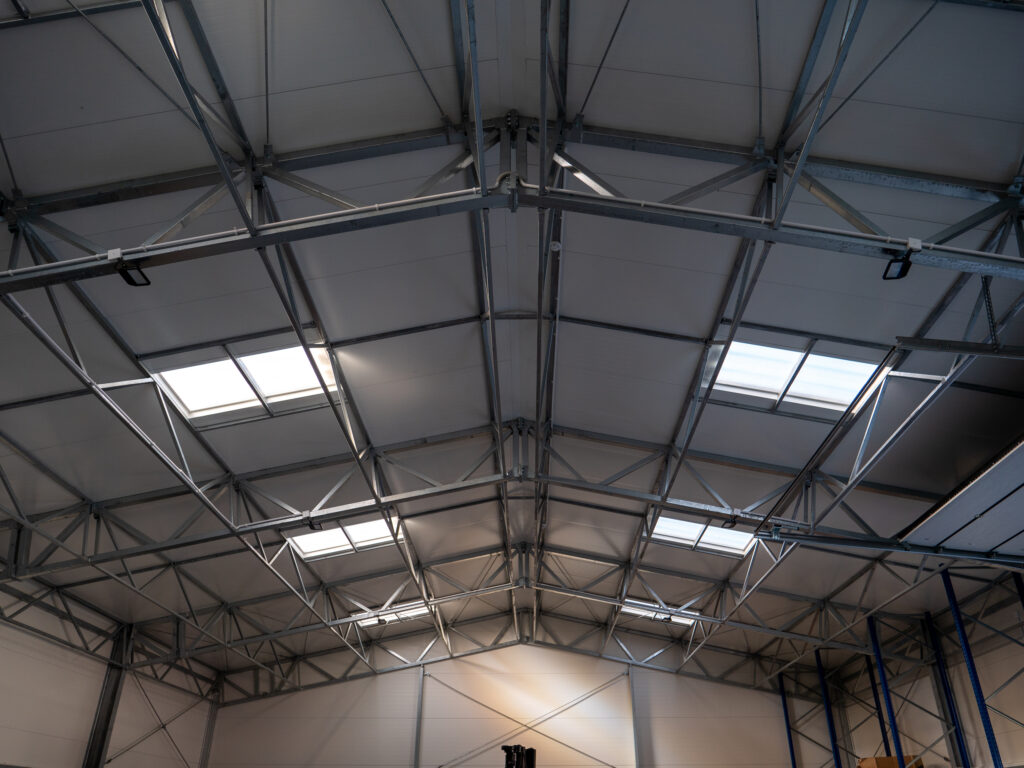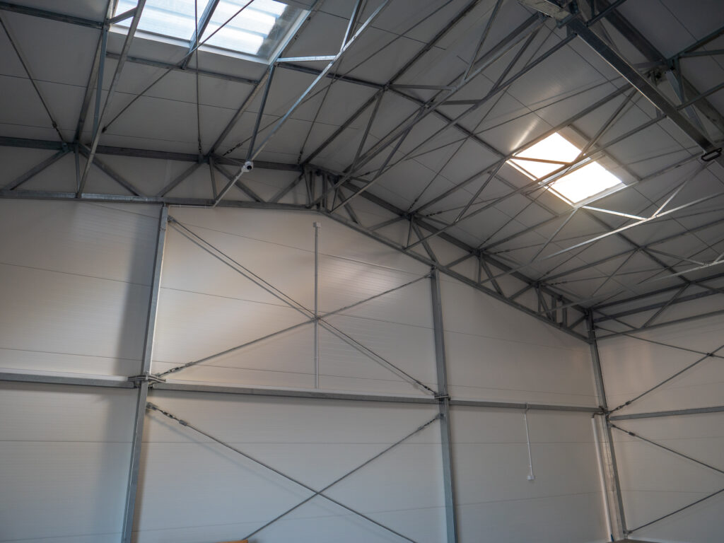 Die Halle bietet vielseitigen Lagerraum, ideal für Unternehmen, die eine funktionale und energieeffiziente Einrichtung suchen. Hervorragende Tageslichtbeleuchtung durch Oberlichter und PIR-Isolierung sorgen für eine komfortable Nutzung das ganze Jahr über, während die robuste Konstruktion eine flexible Anpassung an unterschiedliche Geschäftsanforderungen ermöglicht.