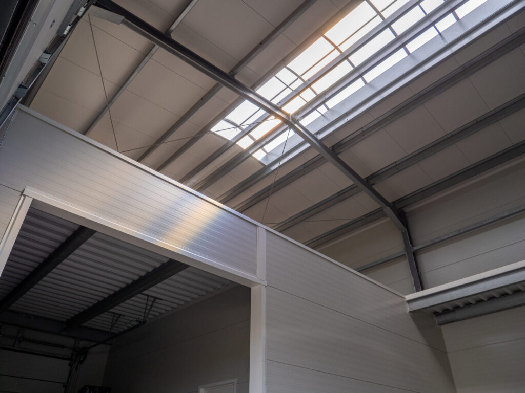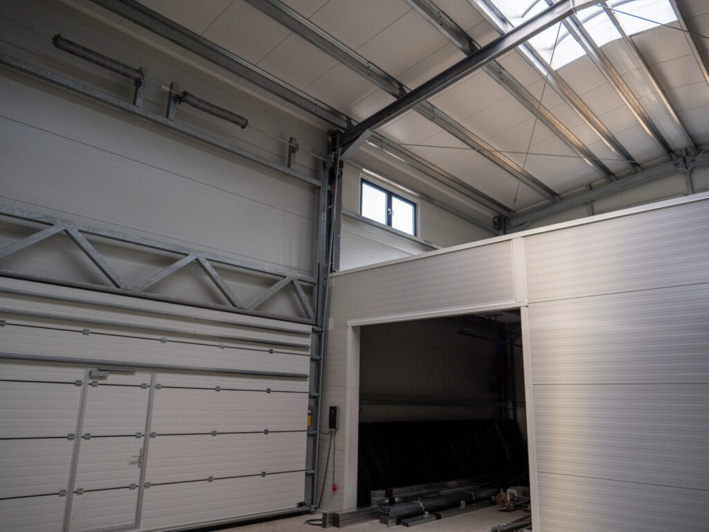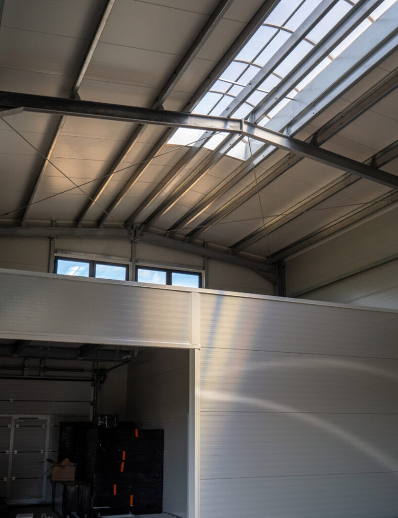 Die Halle wurde so konzipiert, dass sie praktische Vorteile mit einem attraktiven Erscheinungsbild verbindet. Das Zwischengeschoss vergrößert die Nutzfläche und ermöglicht die Einrichtung von Büros, Lagern oder technischen Anlagen. Der Garagenplatz erweitert die Funktionalität des Gebäudes, und dank des Schaufensters und des Dachbodens sieht die Halle repräsentativ aus und ist eine perfekte Ergänzung zum Backsteingebäude. Es handelt sich um eine ideale Lösung für ein modernes Lager mit einem Ausstellungsbereich, einer Serviceeinrichtung oder einem Backoffice.