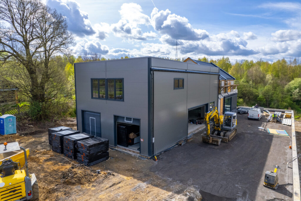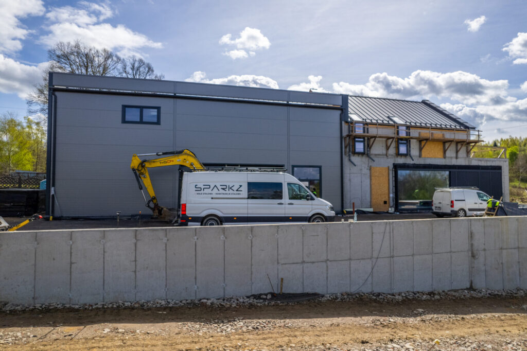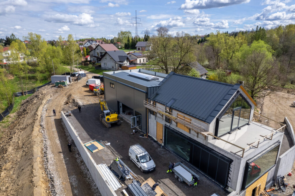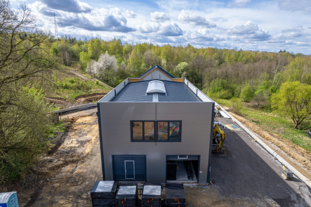 Die moderne PIR-Sandwich-Paneel-Halle, die an das bestehende Backsteingebäude angebaut wurde, ist eine funktionale und ästhetisch ansprechende Erweiterung der Nutzfläche. Das Gebäude verfügt über ein Zwischengeschoss, das ein zweites Stockwerk schafft und eine effiziente Raumnutzung ermöglicht. Der Erdgeschossbereich ist in praktische Garagenräume unterteilt. Die Front und die Seiten der Halle sind mit einem repräsentativen Schaufenster versehen, das natürliches Licht einlässt und das Prestige der Investition unterstreicht. Hinzu kommt ein Dachgeschoss, das die Dachschräge verdeckt und dem Gebäude eine moderne und elegante Form verleiht.