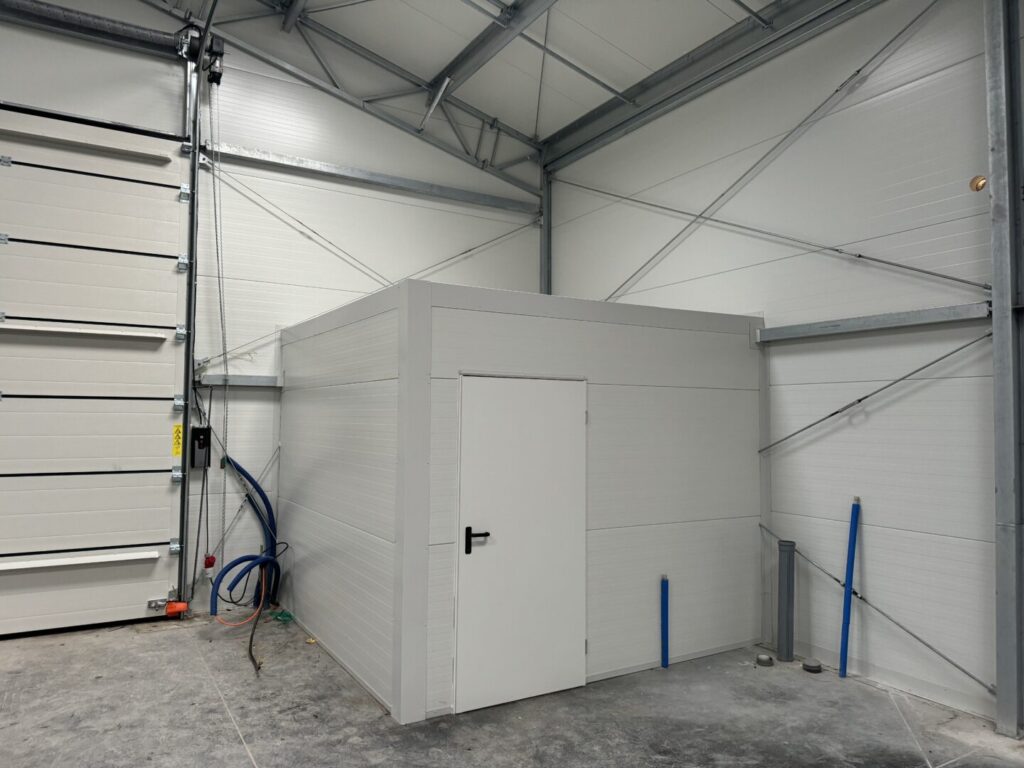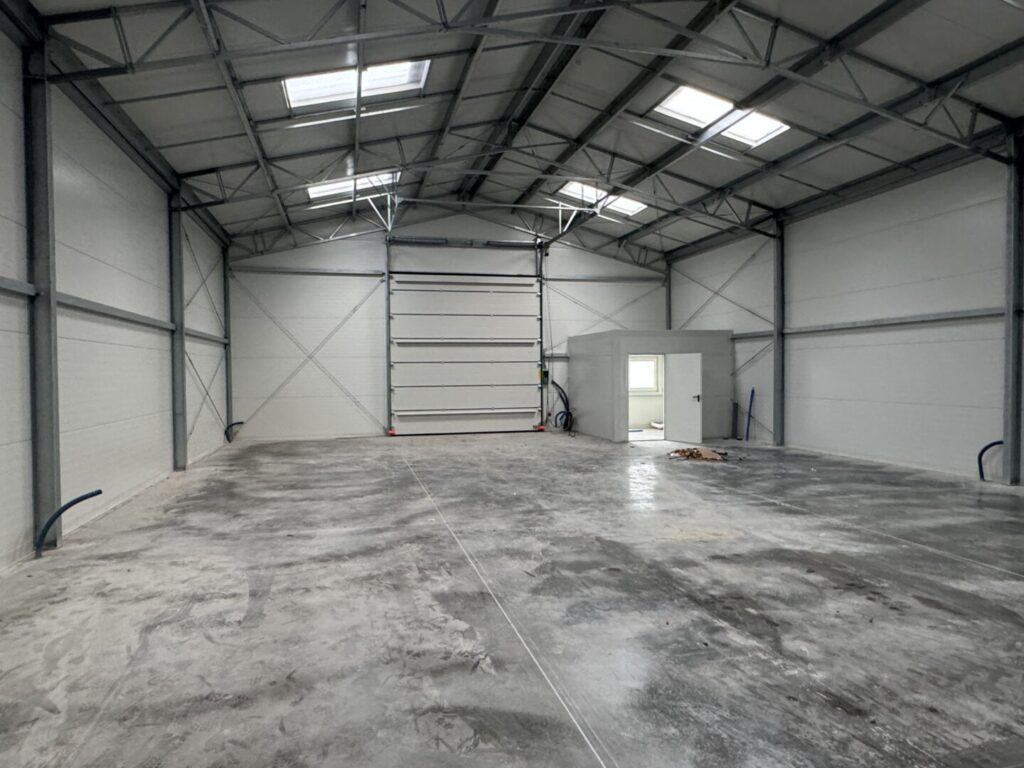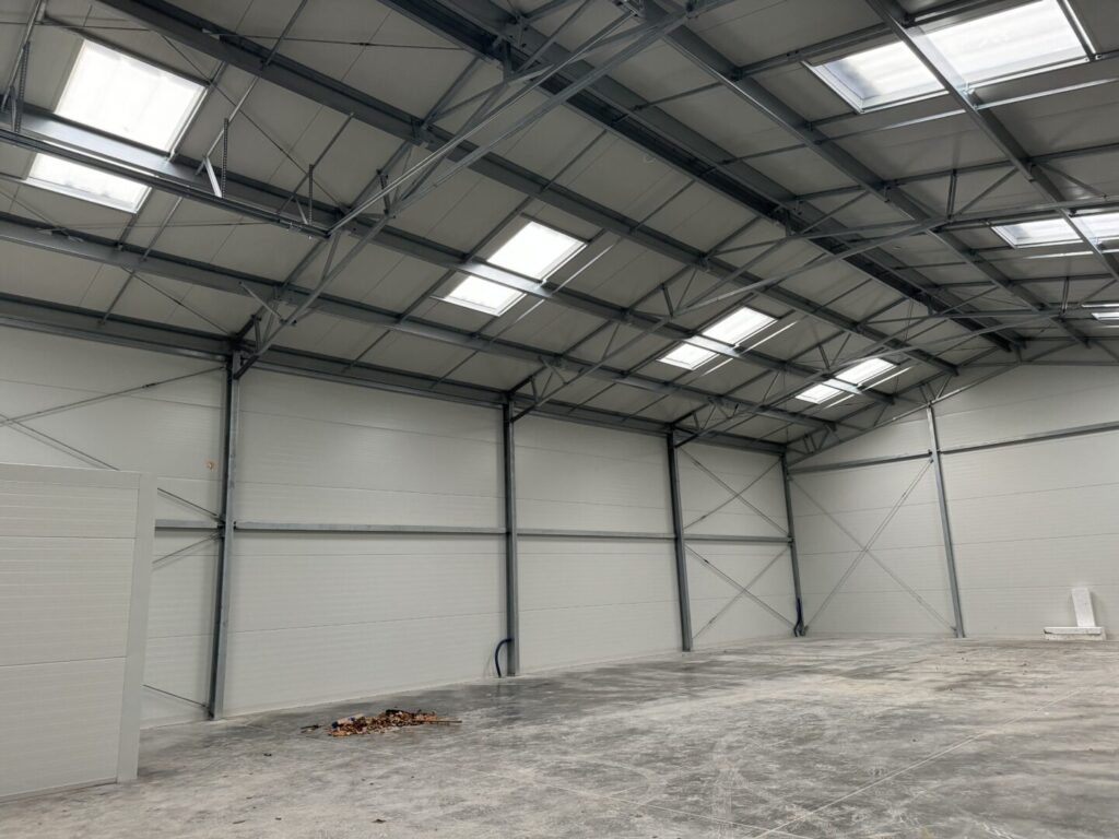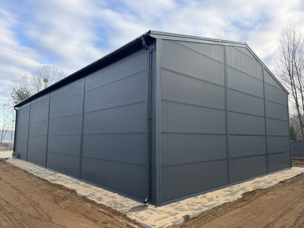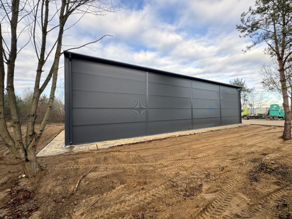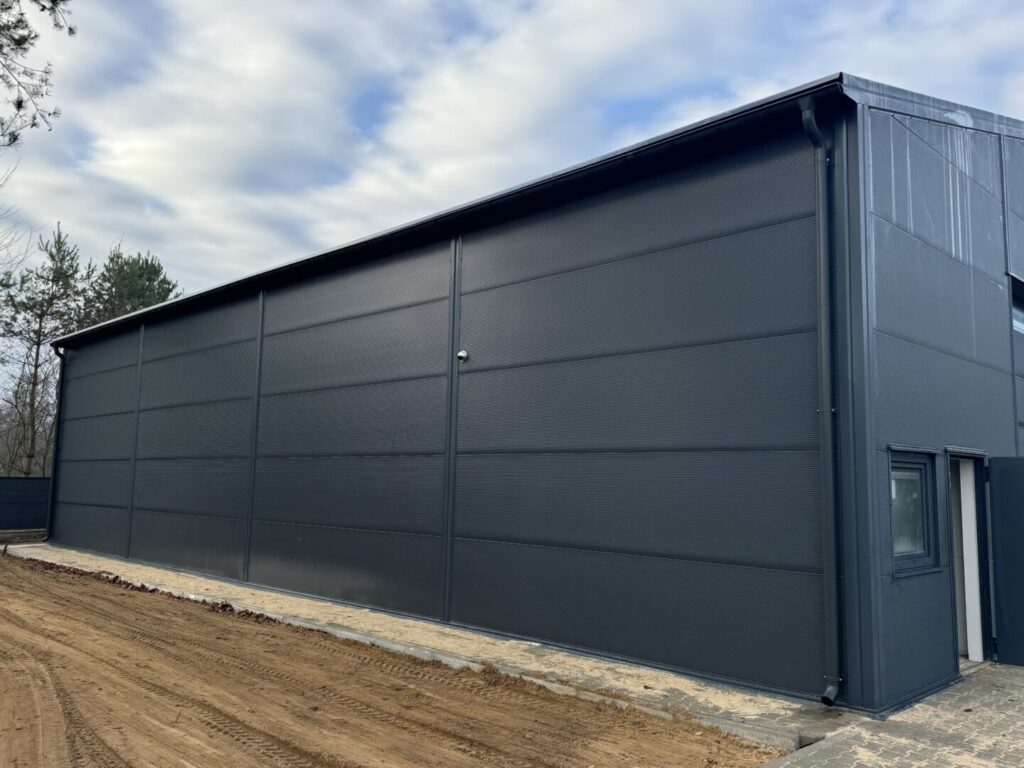 Eine moderne isolierte Halle in einer eleganten dunklen Graphitfarbe mit einer feuerverzinkten Stahlkonstruktion, die Langlebigkeit und Wetterbeständigkeit garantiert. Die Wände und das Dach sind mit PIR-Verbundplatten verkleidet, die eine hohe Wärmedämmung und ein modernes Aussehen gewährleisten. Dank seiner Ästhetik sieht das Gebäude außerordentlich attraktiv aus und fügt sich perfekt in seine Umgebung ein.