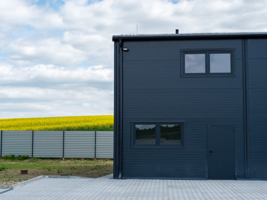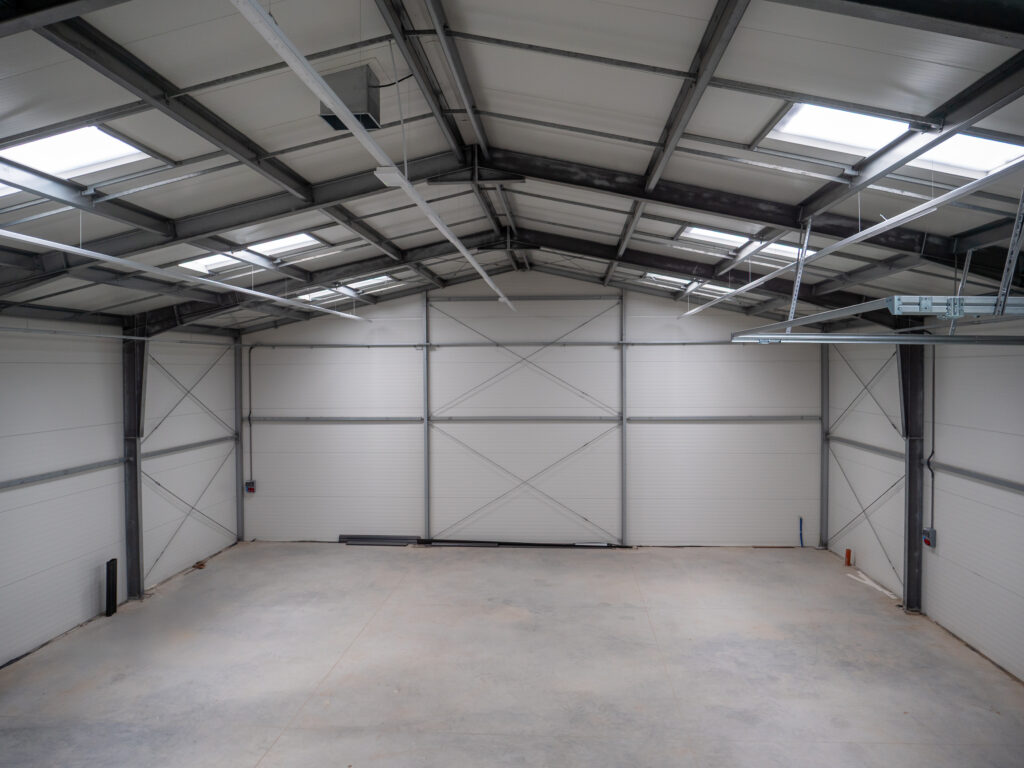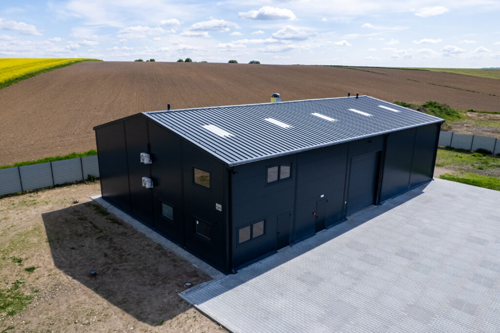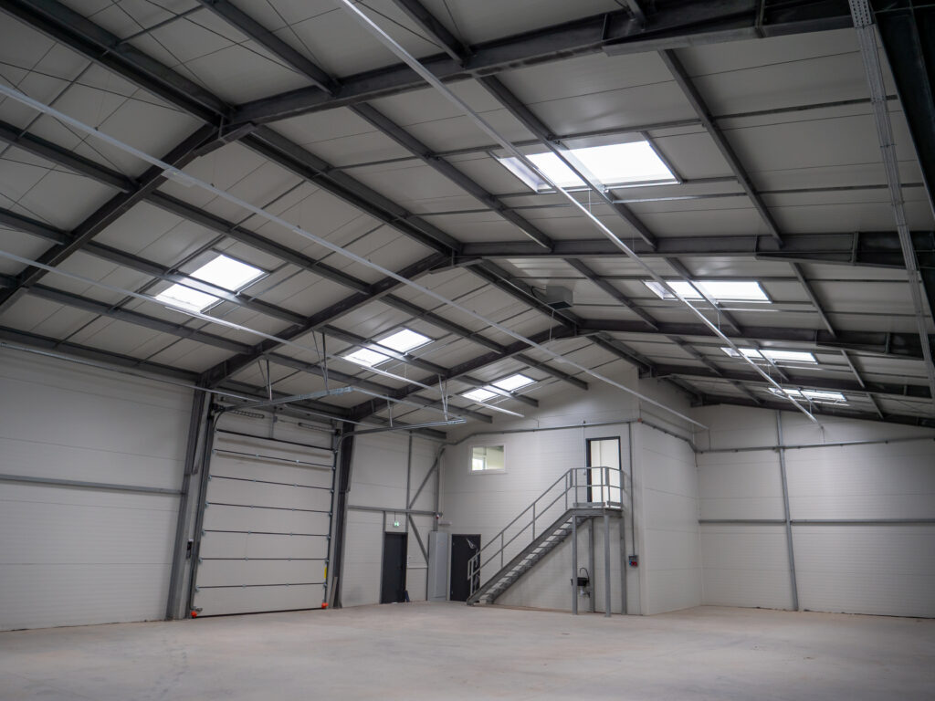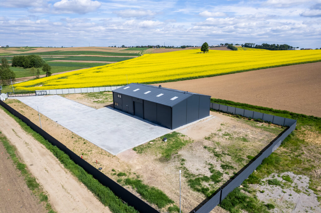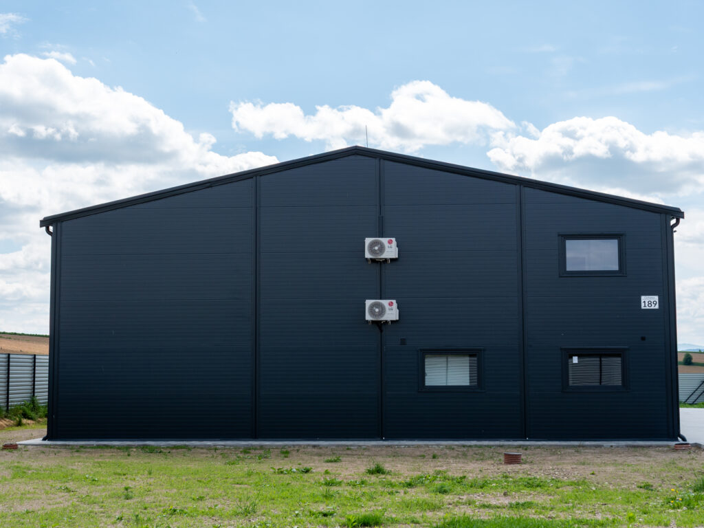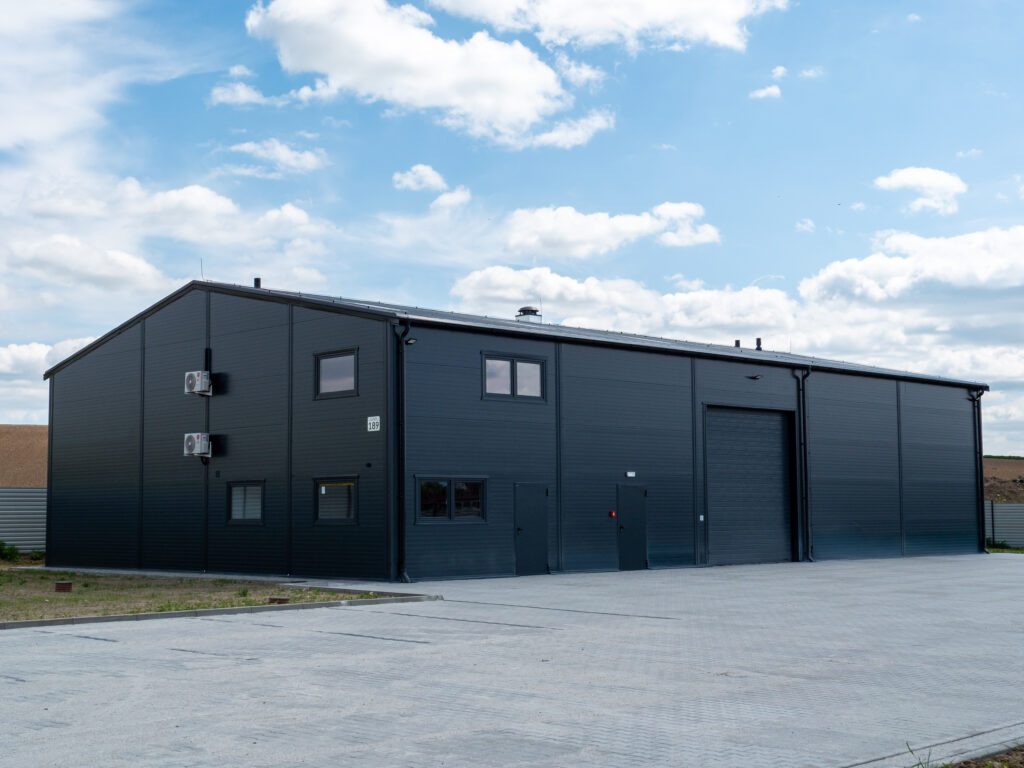 Zrealizowaliśmy halę ocieplaną stalową o wymiarach 16 × 25 × 5,5 m i powierzchni 400 m², wzbogaconą o część biurową z antresolą. Obiekt wykonano w technologii płyt warstwowych PIR o grubości 100mm, co zapewnia doskonałą izolację cieplną i estetyczny wygląd. Hala wyposażona została w bramę segmentową, drzwi techniczne, okna oraz naświetla połaciowe.