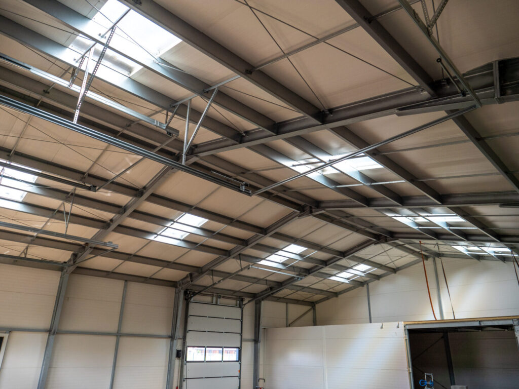 Verkstadshallen är tillverkad av varmförzinkad stålkonstruktion, omsluten av PIR 100-paneler, vilket garanterar hållbarhet och mycket god värmeisolering. Taket är försett med takfönster som garanterar en naturlig och jämn belysning av arbetsstationerna. Anläggningen har sektionsportar som är dimensionerade för bussar och bilar, och den rymliga interiören gör det möjligt att utföra service- och reparationsarbeten på ett bekvämt sätt.